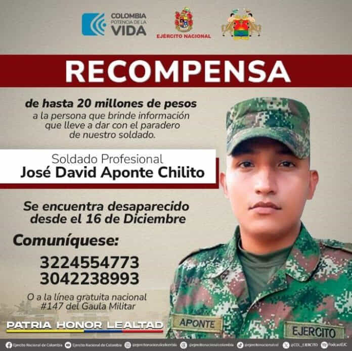 La Gobernación del Meta anunció una recompensa de hasta 20 millones de pesos, por información que permita dar con el paradero del soldado profesional José David Aponte Chilito, quien desapareció en la vía que conduce de Puerto Gaitán al municipio de La Primavera, en el departamento de Vichada.
