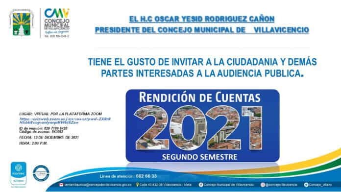 Conforme a la Ley 136 de 1994, Ley 1474 de 2011Estatuto Anticorrupción y el Reglamento Interno de la corporación, el presidente Oscar Yesid Rodríguez Cañón convocó a la ciudadanía a la audiencia pública de Rendición de Cuentas del segundo semestre de 2021 para este lunes 13 de diciembre a las 2pm de forma virtual.