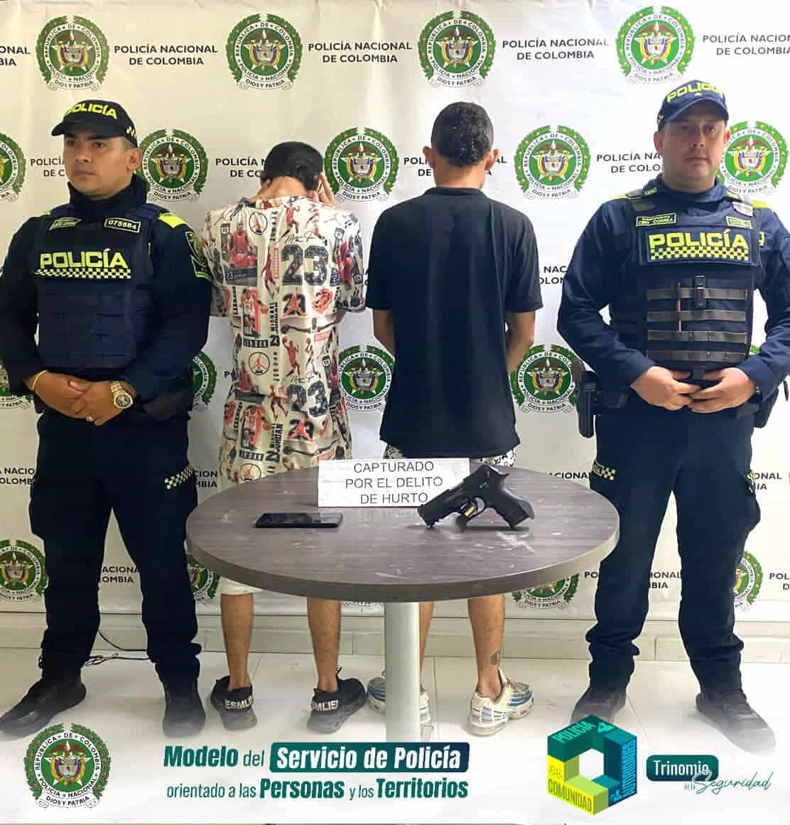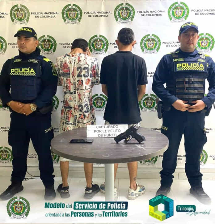 La denuncia oportuna de las víctimas y la rápida reacción de las patrullas de vigilancia, hizo posible que estos sujetos fueran interceptados unas cuadras más adelante de dónde ocurrió el hecho, hallando en su poder una pistola traumática. Elementos con el que cometieron el hurto.