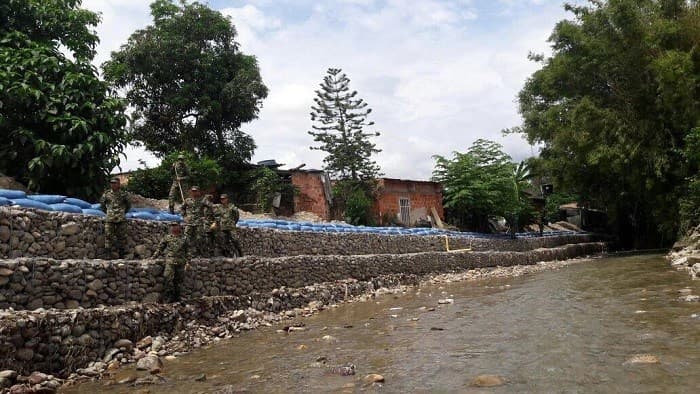 Explicó que para estos trabajos fue necesaria la intervención de 50 uniformados del Ejército, que en articulación con el personal y la maquinara de la Secretaría de Infraestructura del municipio, permitieron compactar 528 metros cúbicos de piedra, 264 mallas y 180 lonas de protección de talud, para la terminación de los gaviones.