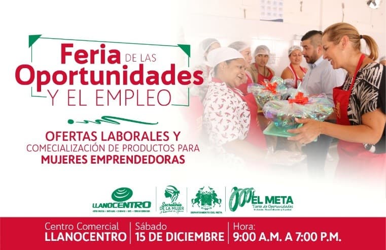 Mujeres emprendedoras del Meta presentarán sus productos mañana sábado 15 de diciembre en el centro comercial Llanocentro de Villavicencio, durante la ‘Feria de las Oportunidades y del Empleo’, donde se llevarán más de 700 ofertas laborales bajo el liderazgo de la Secretaría de la Mujer y Equidad de Género departamental.