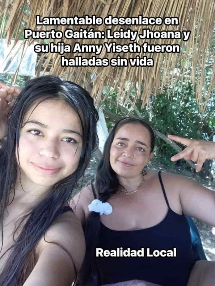 Leidy Jhoana y su pequeña hija Anny Yiseth, quienes habían sido reportadas como desaparecidas desde el pasado sábado en el municipio de Puerto Gaitán, Meta, fueron encontradas sin vida este sábado en aguas de un caño cercano a una institución educativa rural en la vereda Alto Manacacías.